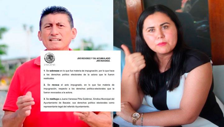 Lo anterior, al resolver el Juicio para la Protección de los Derechos Político Electorales de la Ciudadanía Quintanarroense JDC/023/2022 y su acumulado JDC/024/2022, que fueran presentados por Juana Vanessa Piña Gutiérrez en contra de la determinación de revocarle su carácter de apoderada jurídica del Ayuntamiento de Bacalar, aprobada en la Primera Sesión Extraordinaria de Cabildo celebrada el 11 de julio del año en curso, y el Acta de Acuerdos que deriva de la referida sesión, publicada en el Periódico Oficial del Estado de Quintana Roo, el 19 de julio de 2022.