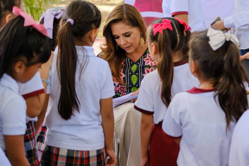 La gobernadora Mara Lezama estuvo acompañada del alumno Geovanny Martínez, del 6º grado, quien agradeció el domo a nombre de todos sus compañeros, quienes también participaron en el corte del listón de inauguración.