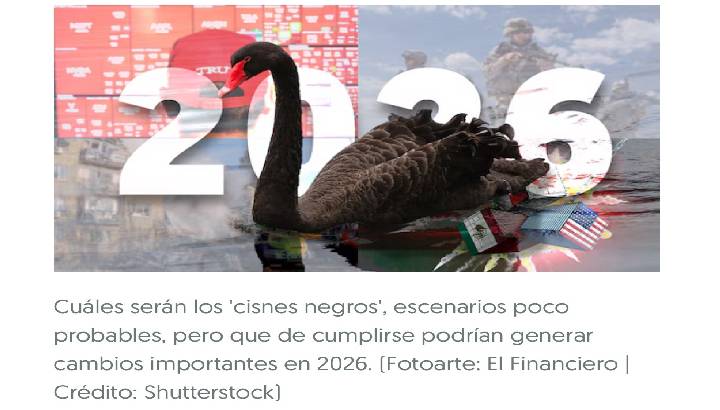 El 27 de diciembre, 2025, la redacción de El financiero publicó los siguientes cisnes negros para México: Estados Unidos sale del T-MEC; EU interviene militarmente en contra de los carteles; Morena tiene rupturas internas muy serias; México pierde el grado de inversión; la inseguridad se sale de control. Desde el punto de vista internacional están: China invade Taiwan; la guerra Rusia-Ucrania escala hasta Europa; la burbuja económica causada por la inteligencia artificial estalla; el presidente de EU muere; una nueva pandemia. https://www.elfinanciero.com.mx/nacional/2025/12/27/que-puede-malir-sal-estos-son-los-10-cisnes-negros-que-podrian-estropearnos-el-2026/