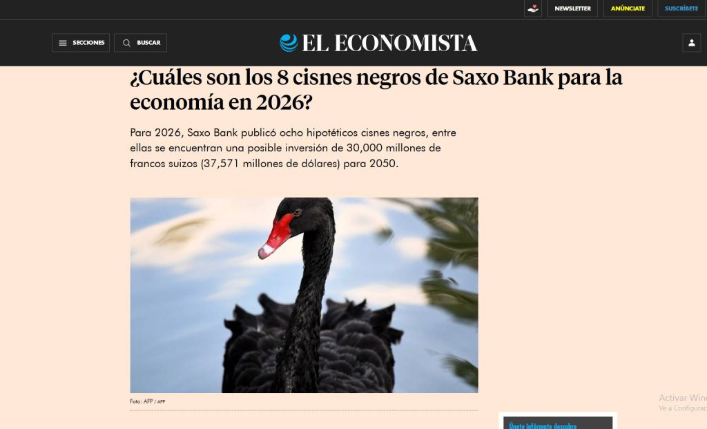 El Economista publicó el 2 de diciembre la lista ofrecida por Saxo Bank, incluyendo: el colapso de las criptomonedas y el incremento significativo del valor del oro; las elecciones en EU; medicamento contra la obesidad para todos, incluyendo las mascotas; la economía basada en la economía espacial se acelera; las decisiones de una empresa Fortune tomadas por inteligencia artificial; el Yuan chino desafía la hegemonía del dólar; la inteligencia artificial sin supervisión puede provocar errores garrafales en algoritmos. https://www.eleconomista.com.mx/economia/son-8-cisnes-negros-saxo-bank-economia-20251202-789213.html
