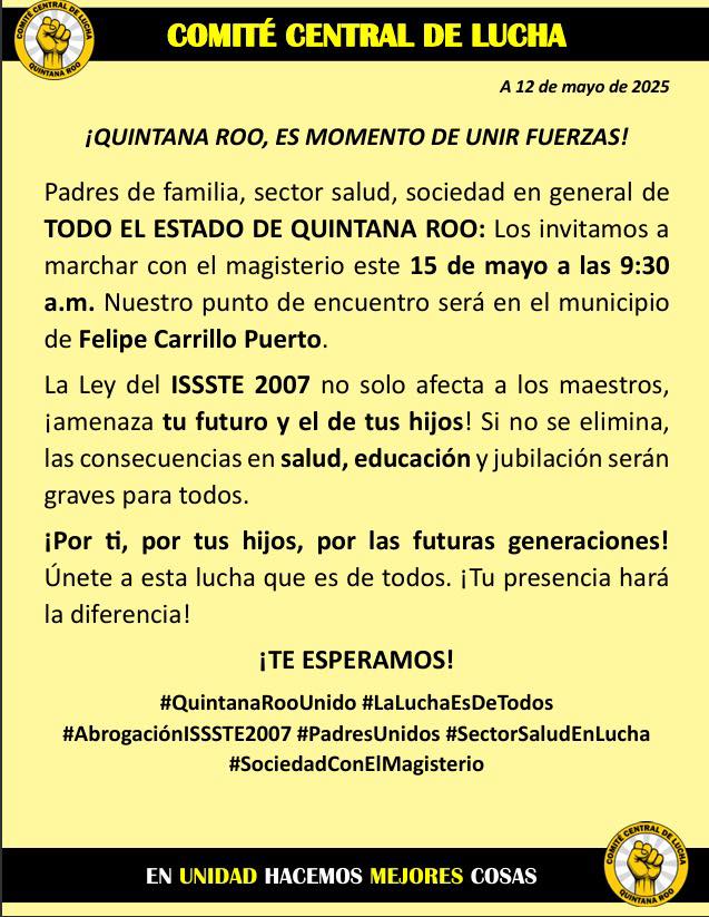 La cúpula incitadora de maestros de la CNTE acordaron realizar desde el próximo 15 de mayo -Día del Maestro- una huelga nacional, lo que contraria al orden constitucional, con el paro a la educación y, por ende, volverán a detener las clases de miles de educandos por los maestros paristas en Quintana Roo convocados al llamado de huelga nacional arengados por el Comité de Lucha Magisterial de la CNTE quienes se han convertido en un modelo de la manipulación,