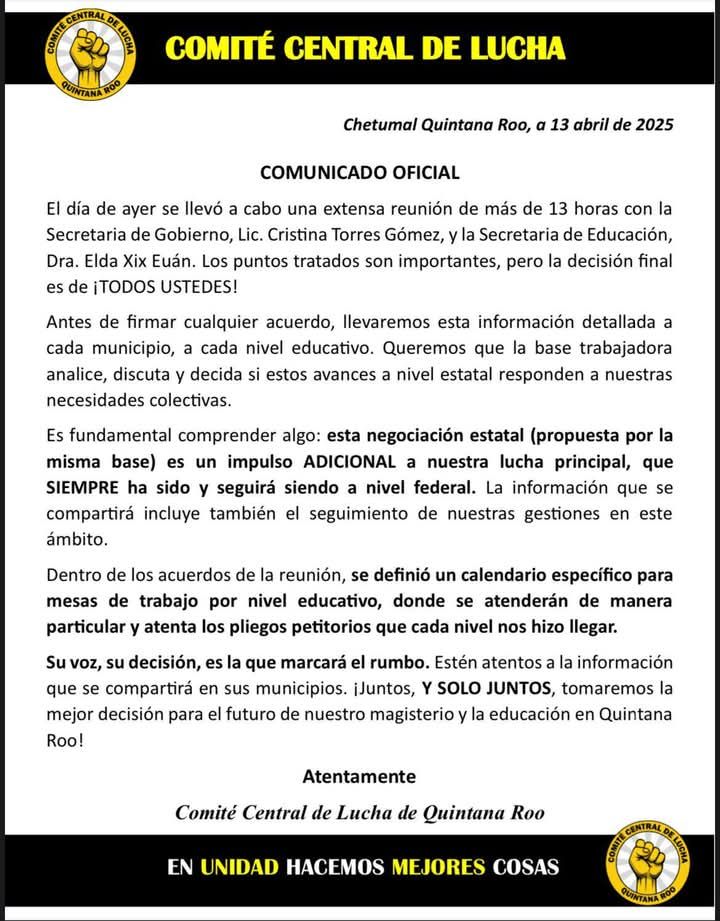 De ese jaez, asaz, el vocero del Comité Central de Lucha, Xavier Méndez, expuso que los acuerdos alcanzados están en riesgo —incluso el tema federal relacionado con la derogación de la Ley del ISSSTE de 2007— si no se firma la minuta propuesta. Aunque, presionado por los manifestantes, dijo que no firmará mientras no se manifieste la base.