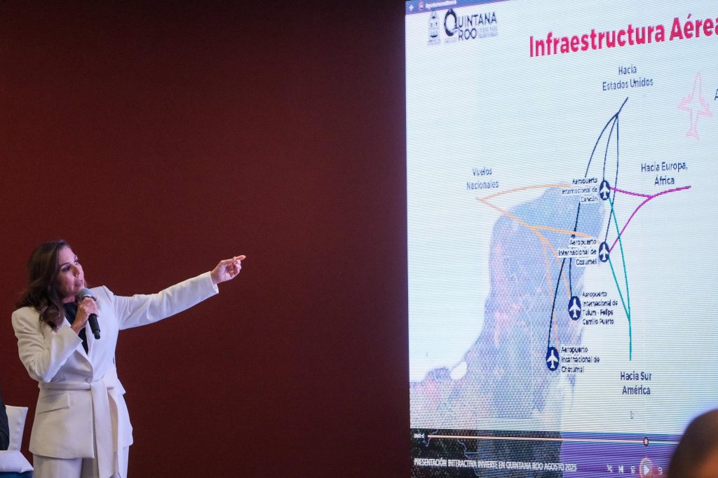 La Gobernadora también aseguró que se cuenta con el respaldo del Gobierno de México que ha convertido a Quintana Roo en prioridad nacional en infraestructura estratégica con el Tren Maya, que tiene 12 estaciones en Quintana Roo, el puente vehicular Nichupté, el corredor turístico Cancún-Isla Blanca y los cuatro aeropuertos internacionales, Cancún, Tulum, Cozumel y Chetumal.