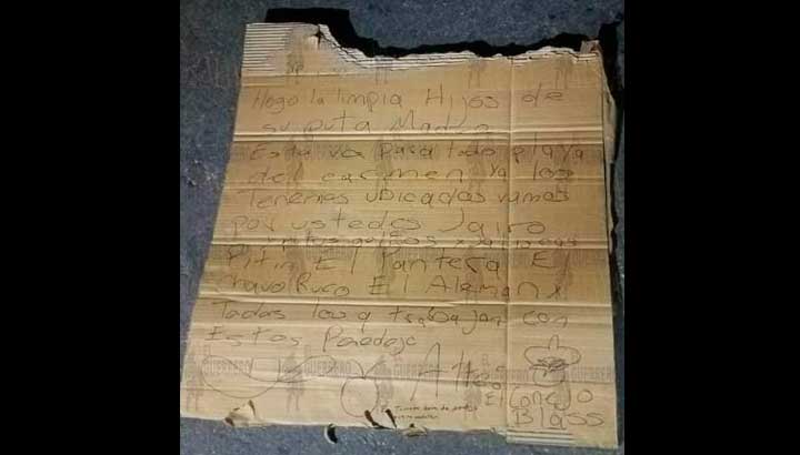 Junto al cadáver del ejecutado número 15 de este narco-violento año 2021, los sicarios dejaron una narco-mensaje escrito en un cartón en color negro conteniendo el siguiente texto: