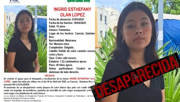 La Fiscalía General del Estado (FGE) de Quintana Roo activó la ficha de búsqueda de Ingrid Esthefany Olán López, una adolescente de 15 años que fue reportada como desaparecida el 30 de abril de 2025 en la ciudad de Cancún, en el municipio de Benito Juárez.