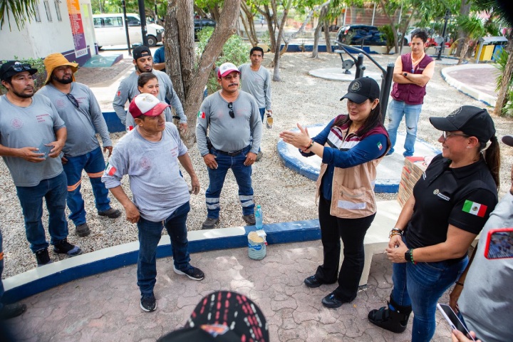 Las acciones incluyen limpieza general, pintura, rehabilitación de áreas ajardinadas, retiro de juegos dañados y residuos, así como poda estratégica de árboles para liberar luminarias y prevenir riesgos ante la temporada de huracanes.