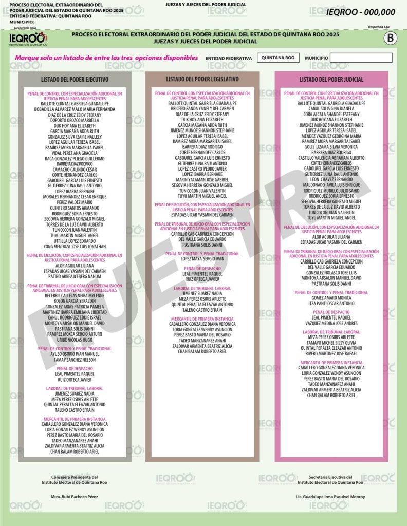 Para magistraturas del Tribunal Superior de Justicia, la papeleta será de color rosa y en tamaño media carta; para magistraturas del Tribunal de Disciplina Judicial será de color azul en tamaño media carta y para juezas y jueces del Poder Judicial tipo A y tipo B será de color verde en tamaño carta.