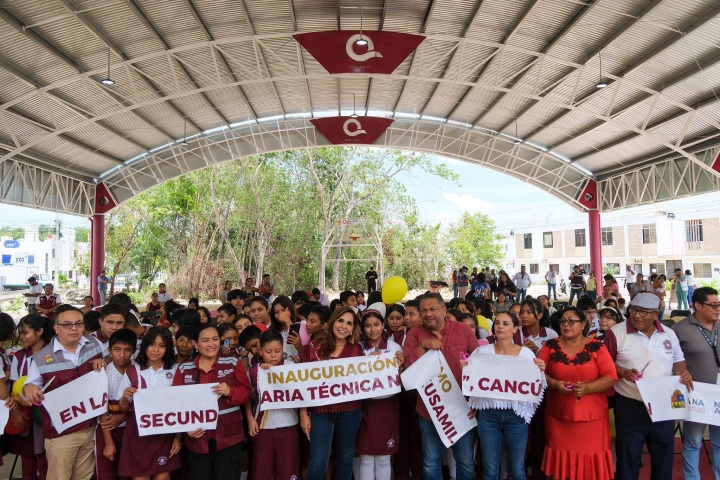 La gobernadora de Quintana Roo anunció que este año “vamos a meterle otros 11 millones de pesos para construir 5 nuevas aulas y poder alcanzar hasta 400 alumnas y alumnos en ambos turnos.