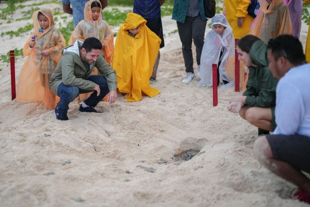 El presidente del Congreso del Estado y líder del Partido Verde en Quintana Roo, Renán Sánchez Tajonar, junto a su esposa Vale, visitó el Campamento Tortuguero San Martín en la zona oriente de Cozumel, donde participó en la liberación de crías de tortuga marina, reafirmando su compromiso con la conservación ambiental y la educación ecológica en la isla.