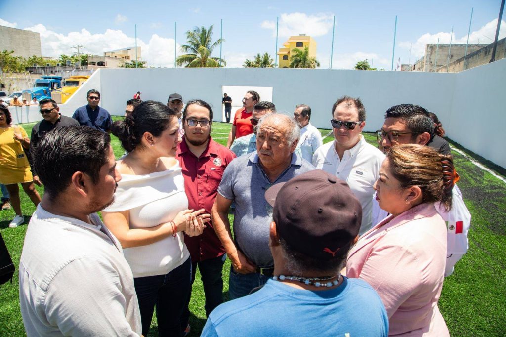 La presidenta municipal Estefanía Mercado encabezó la inauguración de una cancha de fútbol 7 y otra de básquetbol en el emblemático Sindicato de Volqueteros “José Quiam Chan”, uno de los más antiguos de Playa del Carmen y símbolo del trabajo colectivo que hoy se suma a la construcción de paz y prosperidad que encabeza su gobierno.