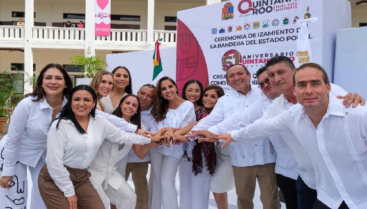 La gobernadora Mara Lezama Espinosa encabezó la ceremonia de izamiento de la bandera de Quintana Roo en ocasión del 51 aniversario de su creación como Estado Libre y Soberano, evento en el que se estrenó la Banda de Guerra Monumental de más de 112 elementos, niños y jóvenes, así como las escoltas de Bandera Nacional y Estatal que se integra con 8 organizaciones cívicas libres y planteles educativos.