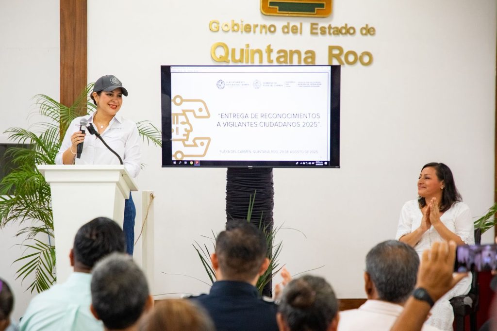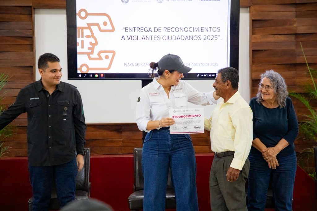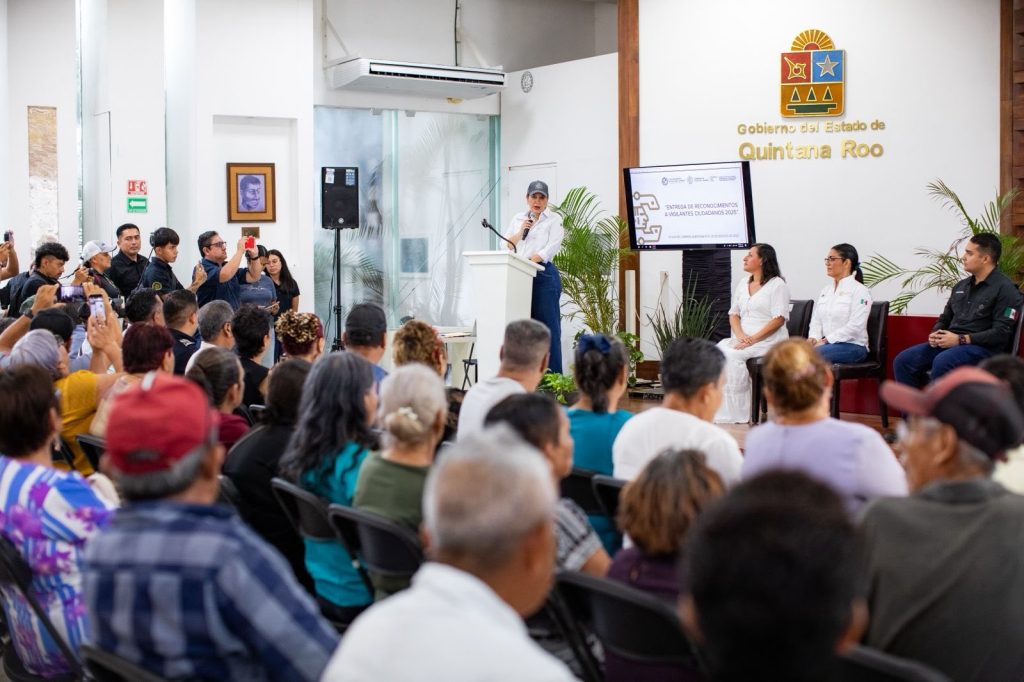 La alcaldesa recordó que los adultos mayores que participan en Vigilantes Ciudadanos realizan labores de acompañamiento en escuelas, contribuyendo a la seguridad de niñas, niños y adolescentes, además de fortalecer el tejido social de Playa del Carmen.