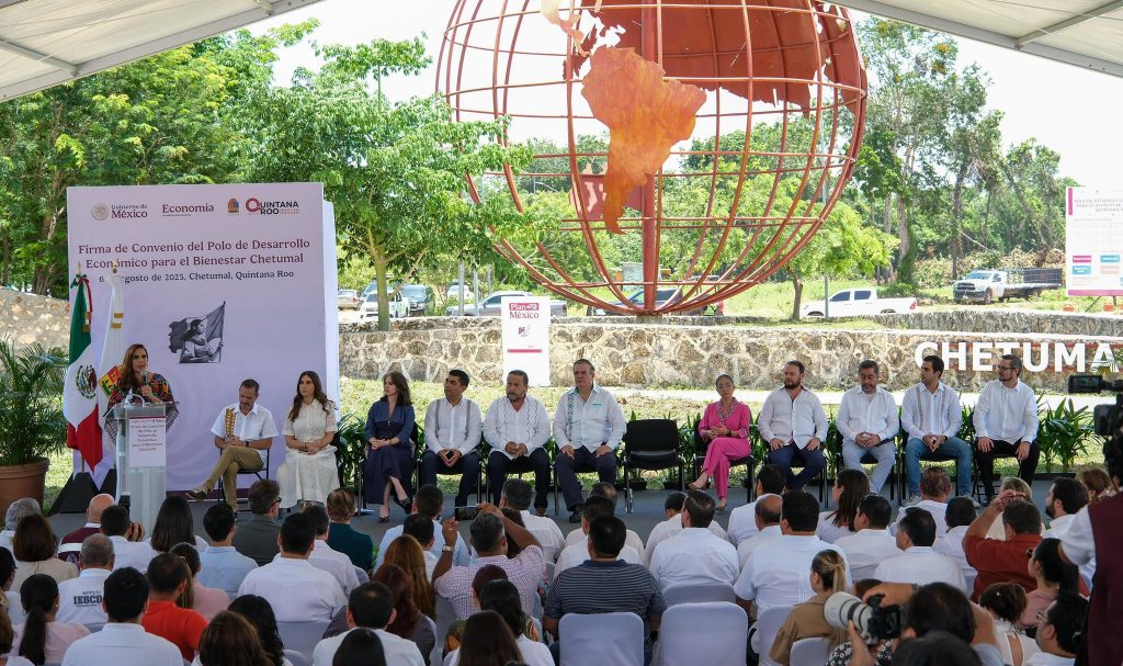 En la sede del Recinto Fiscalizado Estratégico, lugar donde operará este Polo, el secretario Marcelo Ebrard informó que, por instrucciones de la presidenta Claudia Sheinbaum, Chetumal es el primer punto donde inician las visitas a los polos de desarrollo, con la presencia del equipo de la Secretaría de Economía que acompañará a las autoridades estatales y municipales en la consolidación de esta estrategia.