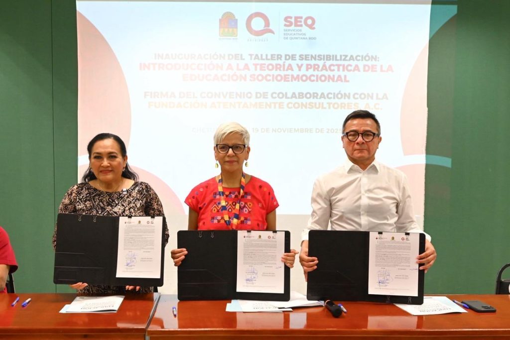 La Secretaría de Educación de Quintana Roo (SEQ) firmó el convenio de colaboración con la Fundación Atentamente Consultores, A.C., con el propósito de implementar el Programa de Educación Socioemocional “Educar para el Bienestar”, durante el periodo de octubre de 2025 a diciembre de 2027, para la realización de cursos, talleres y diplomados para el fortalecimiento de habilidades socioemocionales, tanto de estudiantes como de docentes.