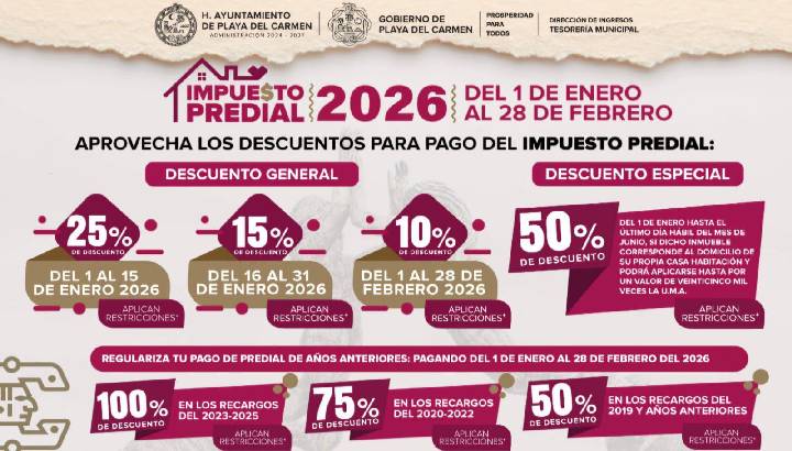 El Gobierno de Playa del Carmen, que encabeza la presidenta municipal Estefanía Mercado, inició el año con un estímulo fiscal para las familias playenses, al autorizar el Cabildo descuentos de hasta 25% en el pago anticipado del impuesto predial durante los primeros 15 días del mes de enero, como parte del Programa de Descuentos y Estímulos Fiscales 2026.