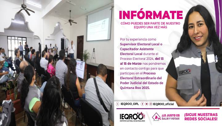 El Instituto Electoral de Quintana Roo (Ieqroo) aprobó la convocatoria permanente para el reclutamiento de supervisores/as electorales locales y capacitadores/as asistentes electorales locales de los once consejos municipales para el Proceso Electoral Extraordinario del Poder Judicial del Estado 2025.