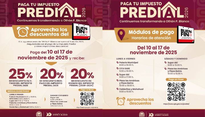 Con el objetivo de cuidar la economía familiar y fortalecer la recaudación para avanzar con la Transformación de Othón P. Blanco, se aplicará un descuento del 25% en el pago del Impuesto Predial del 2026.