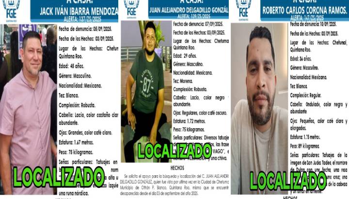 Se trata de Jack Iván Ibarra Mendoza, Juan Alejandro Delgado González y Roberto Carlos Corona Ramos, quienes llegaron a Quintana Roo, por una oferta de trabajo, pero presuntamente fueron víctimas de privación ilegal de la libertad, cuando los sacaron por la fuerza del hotel (a la entrada de Chetumal) en el que estaban hospedados.