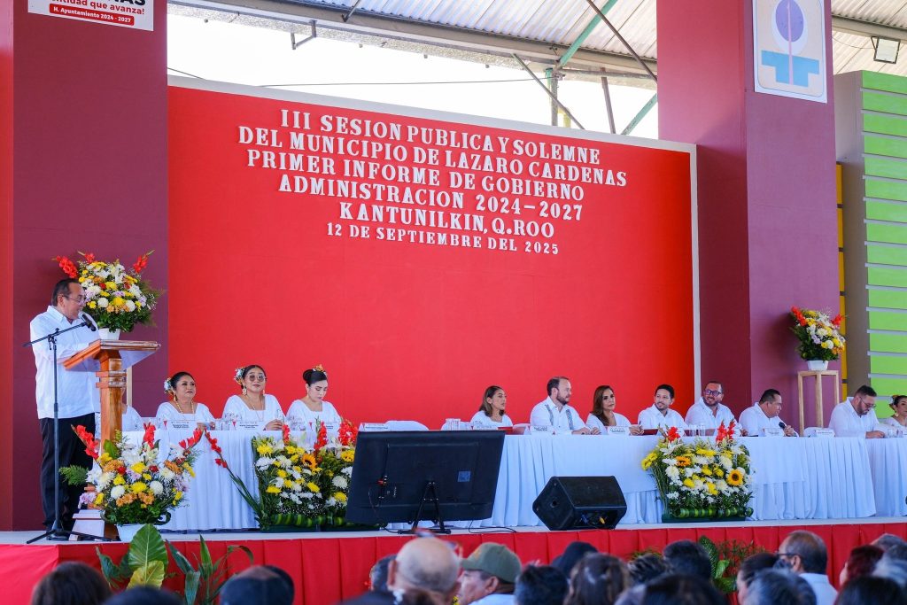 La unidad deportiva “Terencio Tah” fue sede de la sesión solemne de Cabildo, en la que Nivardo Mena dirigió un mensaje a la ciudadanía. Previamente entregó el libro que contiene el estado que guarda la administración municipal a la gobernadora Mara Lezama, titular del Poder Ejecutivo; al magistrado Heyden Cebada Rivas, representante del Poder Judicial; y al diputado Renán Sánchez Tajonar, en representación del Poder Legislativo.