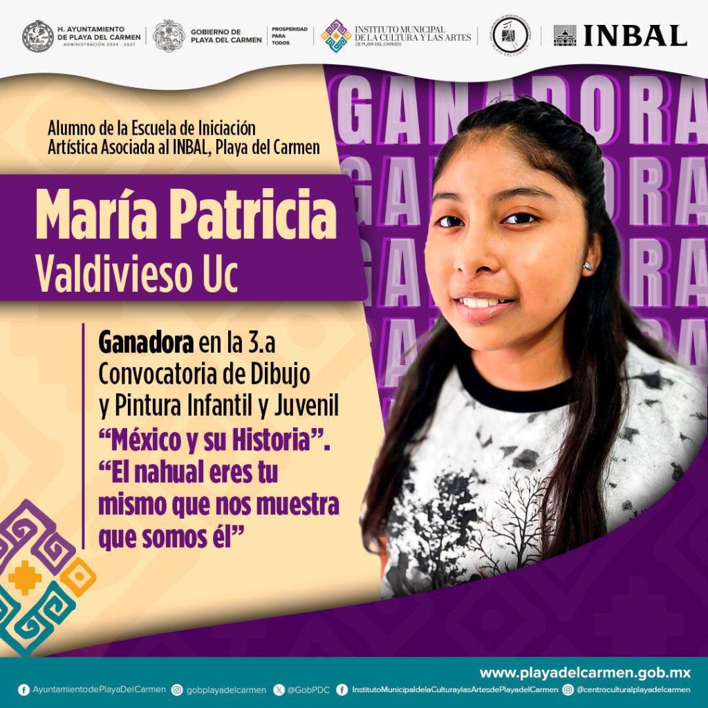La Escuela de Iniciación Artística asociada al Instituto Nacional de Bellas Artes y Literatura (INBAL), informó que su alumna María Patricia Valdivieso Uc de 14 años y su pintura “El nahual eres tú mismo”, ganó la Tercera Convocatoria de Dibujo y Pintura Infantil y Juvenil “México y su historia”, cuya temática fue “Las Leyendas de México”.