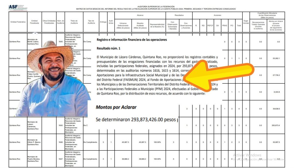 No hay excusas, no hubo error humano en la presentación de los expedientes para comprobar esos recursos federales, el reporte de la ASF es claro: “El Municipio de Lázaro Cárdenas, Quintana Roo, no proporcionó los registros contables y presupuestales de las erogaciones financiadas con los recursos del gasto federalizado, incluidas las participaciones federales, asignadas en 2024, por un monto de 293,873.426, determinados en las auditorías números 1616, 1615 y 1614”. En resumen, pese a haber transcurrido ya dos años, no existe registro físico de esos millonarios recursos, por lo que “se presume un probable daño o perjuicio, o ambos, a la Hacienda Pública Federal”