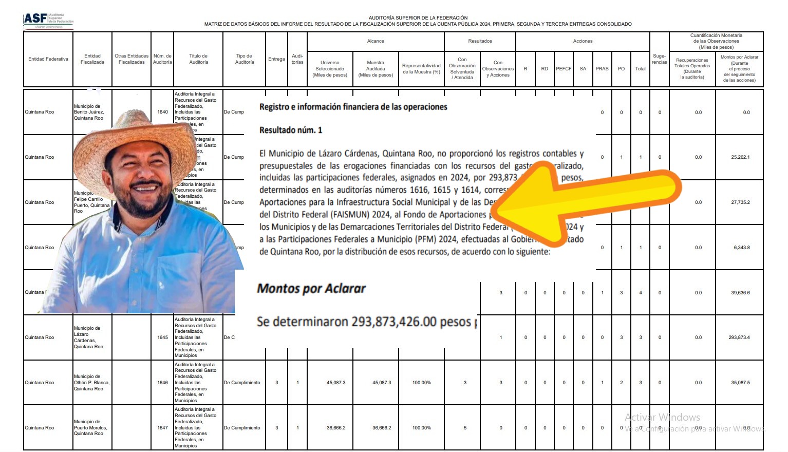 No hay excusas, no hubo error humano en la presentación de los expedientes para comprobar esos recursos federales, el reporte de la ASF es claro: “El Municipio de Lázaro Cárdenas, Quintana Roo, no proporcionó los registros contables y presupuestales de las erogaciones financiadas con los recursos del gasto federalizado, incluidas las participaciones federales, asignadas en 2024, por un monto de 293,873.426, determinados en las auditorías números 1616, 1615 y 1614”. En resumen, pese a haber transcurrido ya dos años, no existe registro físico de esos millonarios recursos, por lo que “se presume un probable daño o perjuicio, o ambos, a la Hacienda Pública Federal”
