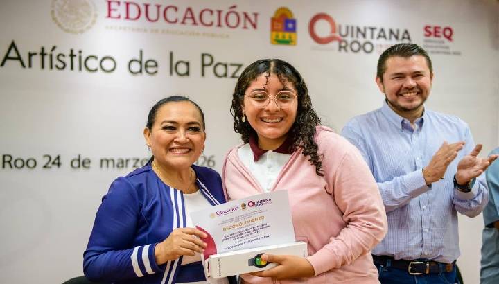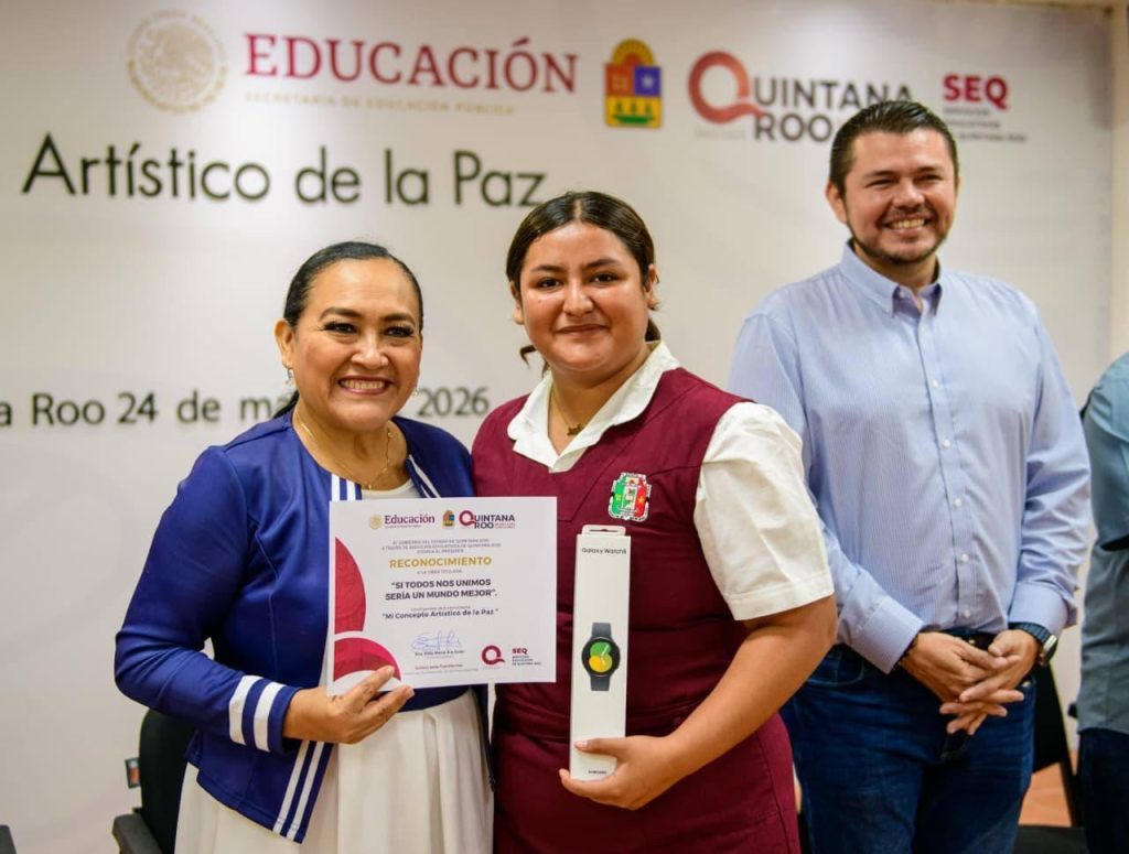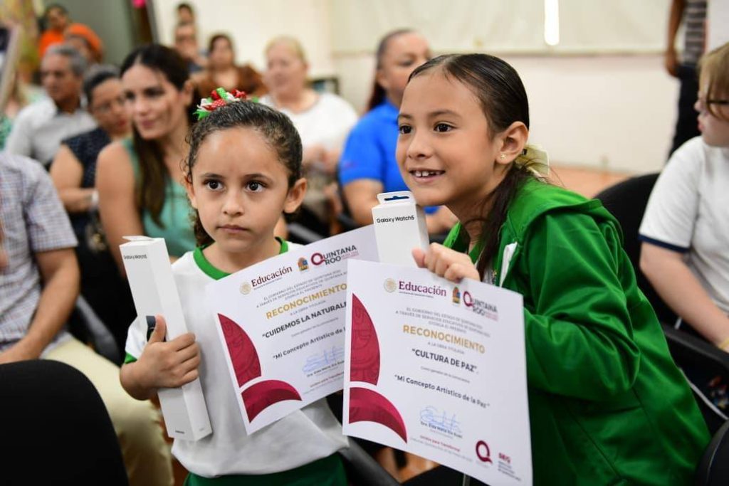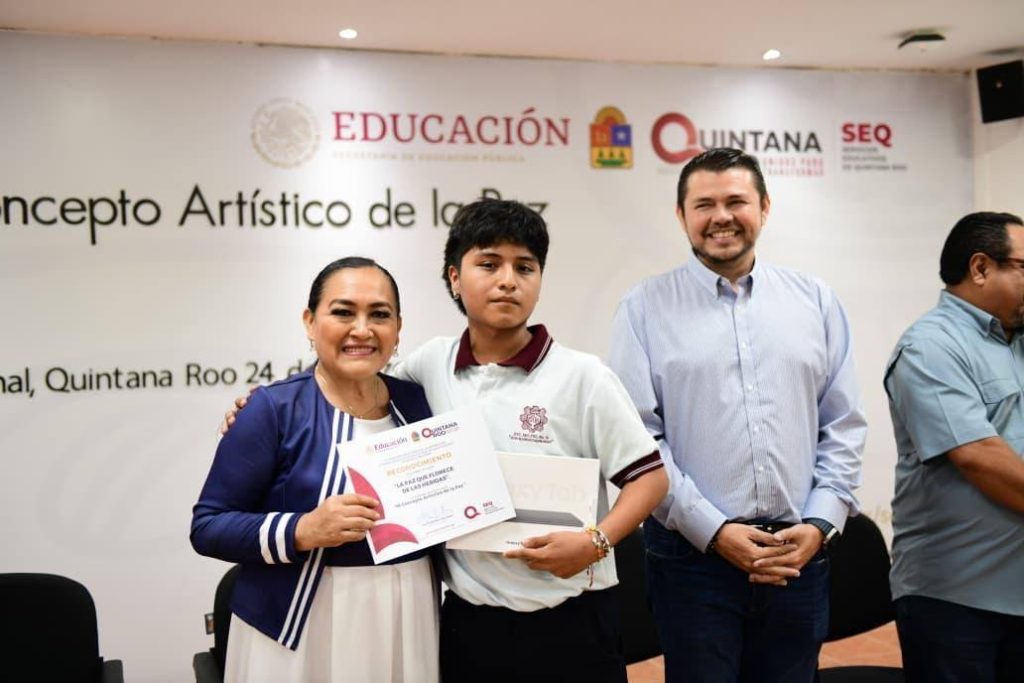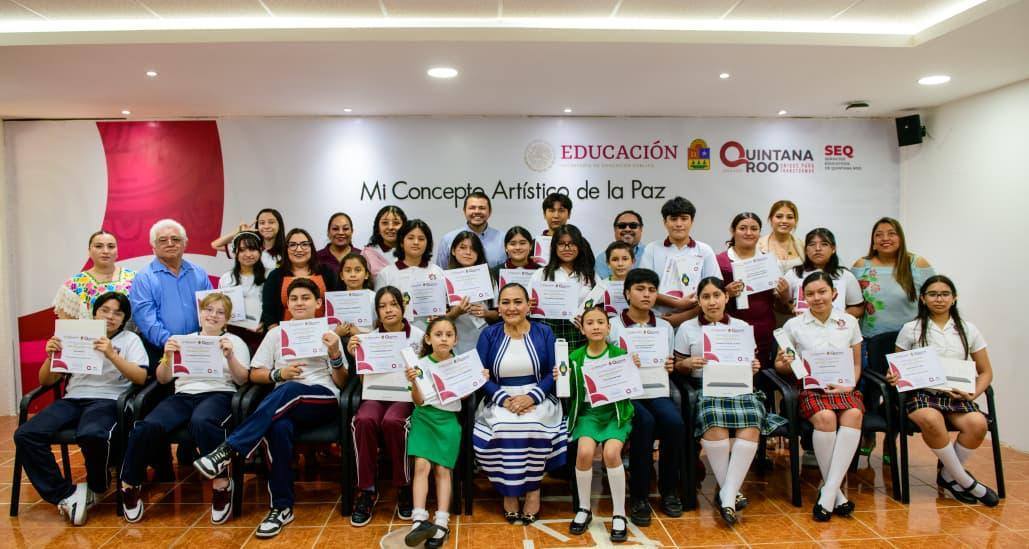 La secretaria de Educación, Elda Xix Euán, encabezó la ceremonia de premiación de los dibujos de la convocatoria “Mi concepto artístico por la paz”, que de manera conjunta se realizó con el Instituto de la Cultura y las Artes de Quintana Roo, para reconocer y promover la participación de las y los estudiantes de educación primaria y secundaria del municipio de Othón P. Blanco, en la construcción de una cultura que fomenten los valores de respeto, convivencia pacífica y prevención de la violencia en el entorno escolar.