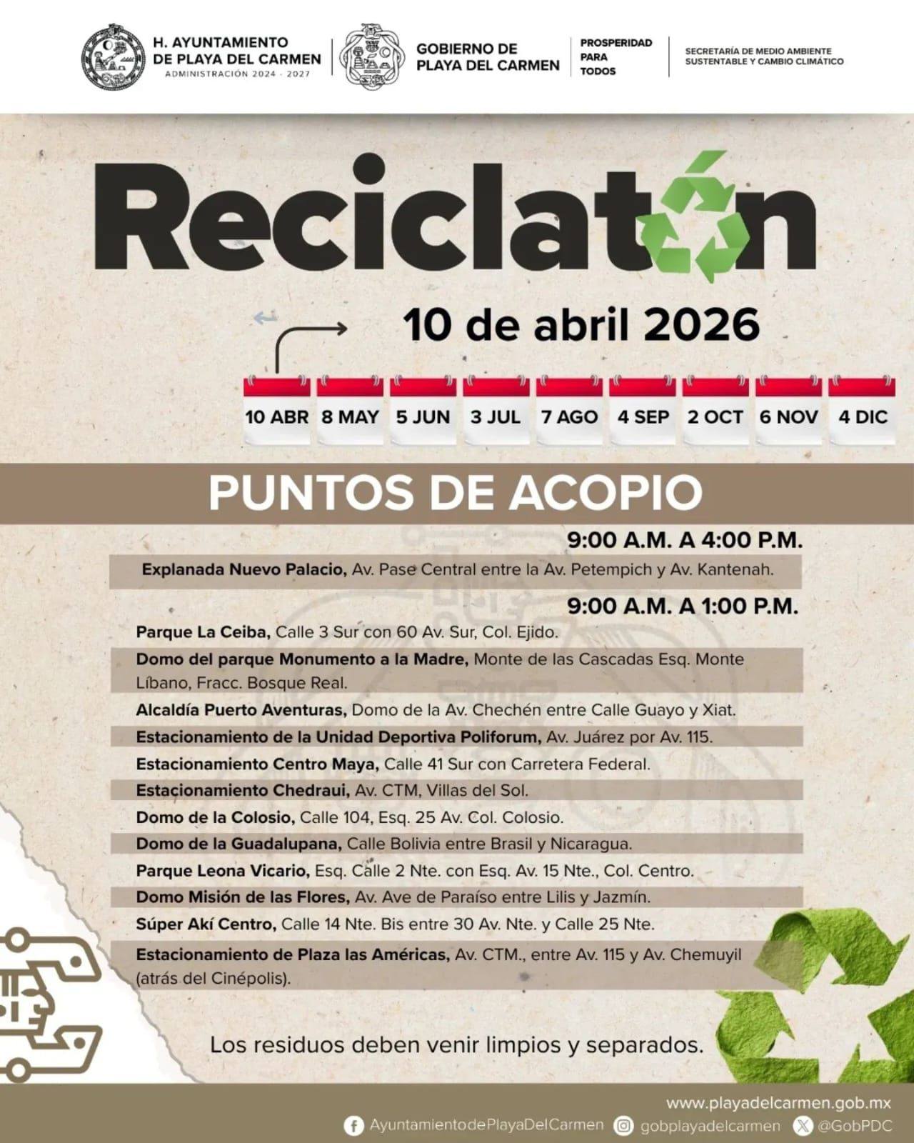 Entre los puntos de recolección se encuentran la explanada del Nuevo Palacio, los domos de los parques Monumento a la Madre, Colosio, Misión de las Flores y Guadalupana, así como la Alcaldía de Puerto Aventuras. También estarán habilitados los estacionamientos de Centro Maya, Plaza Las Américas, Chedraui Villas del Sol y la Unidad Deportiva Poliforum, además de los parques La Ceiba y Leona Vicario y Super Aki Centro.