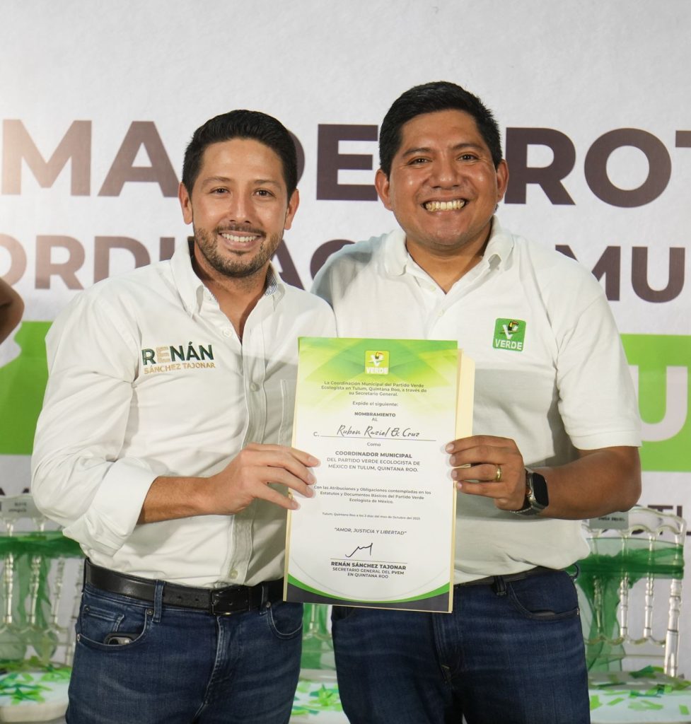 El dirigente estatal del Partido Verde en Quintana Roo, Renán Sánchez Tajonar, encabezó la toma de protesta de la nueva dirigencia municipal del Partido Verde en Tulum, donde resaltó la fuerza, la unidad y el compromiso de la familia Verde en todo el estado.