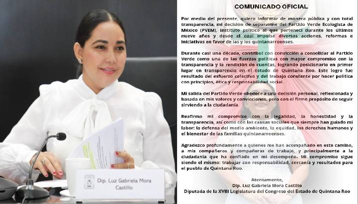 La diputada Luz Gabriela Mora Castillo renunció al Partido Verde Ecologista de México (PVEM), en el cual militó durante nueve años.