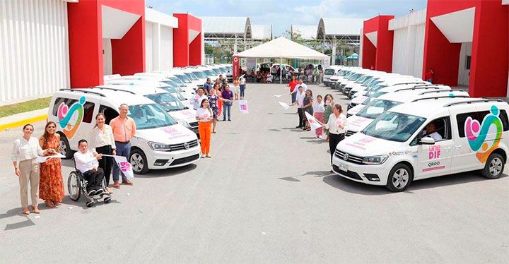 Como parte de las acciones del Nuevo Acuerdo por el Bienestar y Desarrollo de Quintana Roo, que impulsa la gobernadora Mara Lezama Espinosa a través de la Presidenta del Sistema DIF Quintana Roo, Verónica Lezama Espinosa se realizó la re distribución, asignación y entrega de 32 vehículos inclusivos a representantes de los 11 DIF municipales, con el objetivo de eficientar el traslado, atención y servicio de las personas mayores, con discapacidad y limitación de la movilidad.